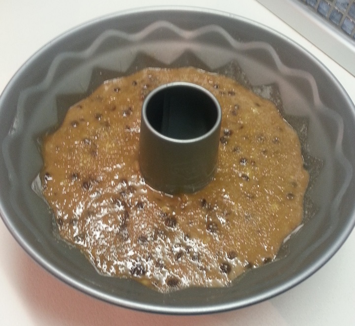 Προθερμαίνουμε το φούρνο στους 180°C αέρα. Αλευροβουτυρώνουμε τη φόρμα, το ταψί ή τα φορμάκια, εάν θέλουμε να κάνουμε ατομικές μεριδούλες. Ρίχνουμε το τελικό μείγμα και το βάζουμε να ψηθεί για 45 λεπτά με 1 ώρα, αναλόγως το φούρνο. Τα φορμάκια θέλουν περίπου 30 λεπτά.