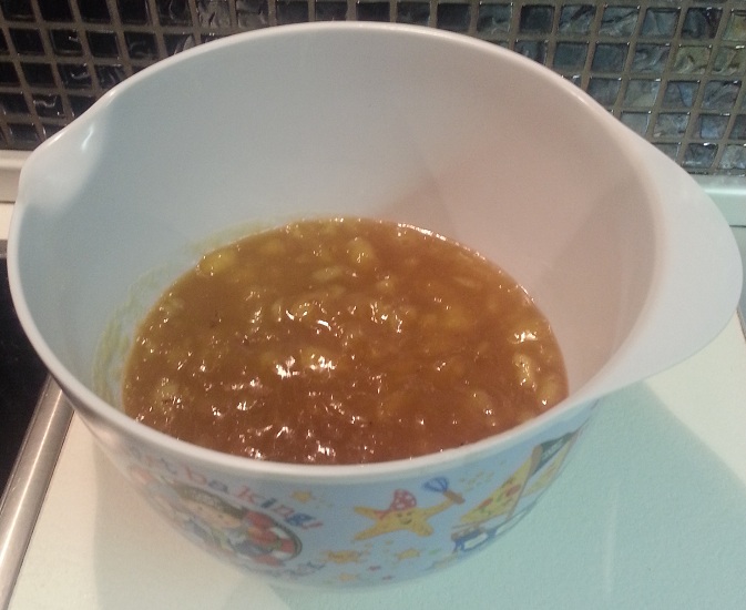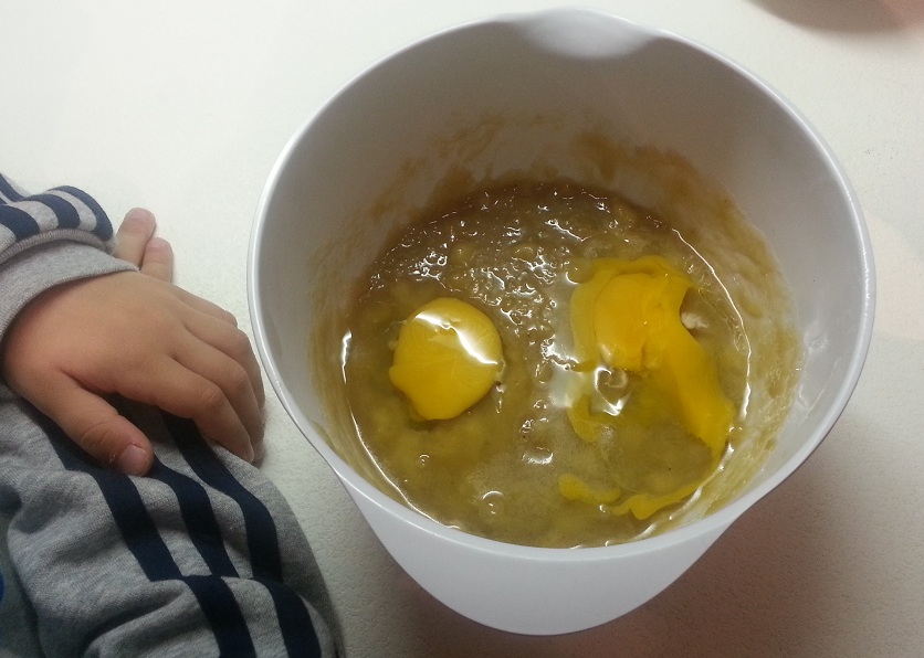 μαλακώσουν οι μπανάνες. Αφήνουμε το μείγμα να κρυώσει λίγο και το βάζουμε στο ψυγείο για καμία ώρα. Έπειτα το βγάζουμε,ρίχνουμε μέσα τα αυγά τα οποία τα έχουμε σε θερμοκρασία δωματίου και ανακατεύουμε καλά το μείγμα.