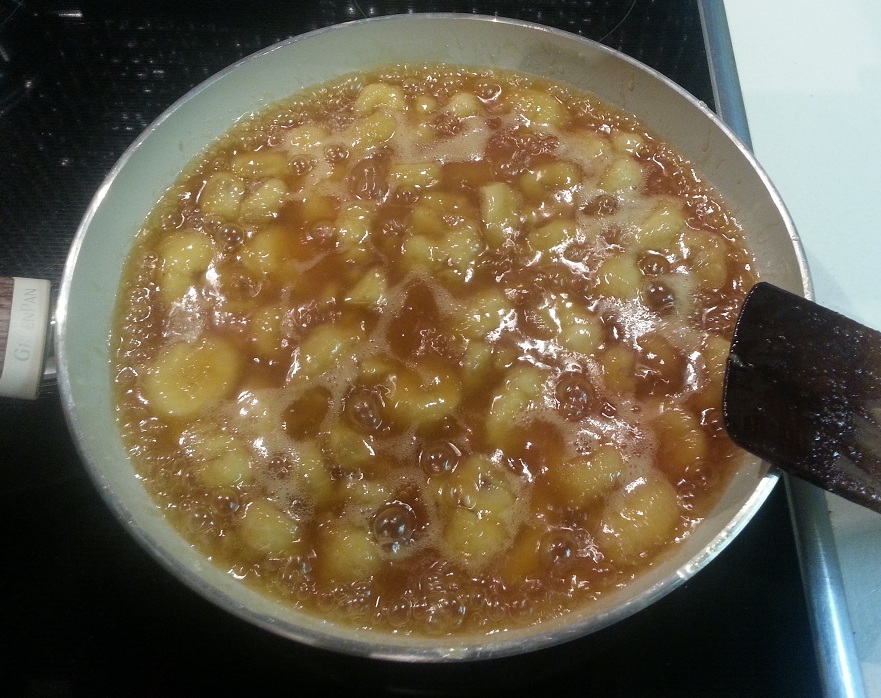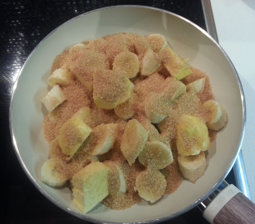 Κόβουμε τις μπανάνες σε κομμάτια,και μαζί με τη ζάχαρη και το βούτυρο, τα βάζουμε σε ένα τηγάνι και τα σοτάρουμε. Ανακατεύουμε απαλά,μέχρι να λιώσει η ζάχαρη και το βούτυρο και να