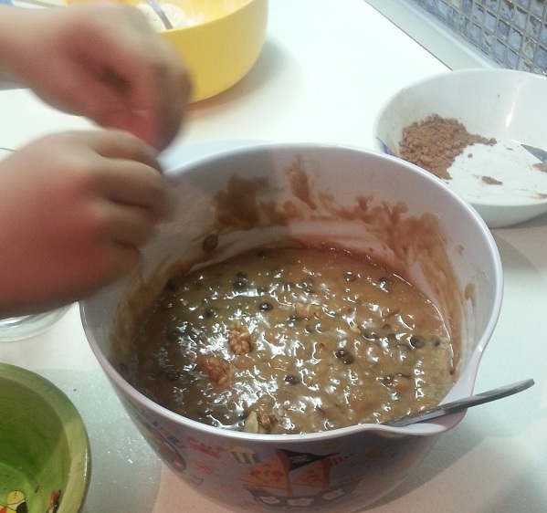 Σε ένα άλλο μπωλ έχουμε ανακατέψει το αλεύρι, τις βανίλιες, τη σόδα και το αλάτι, το κακάο. Εκεί μέσα ρίχνουμε το μείγμα με την μπανάνα, και ανακατεύουμε απαλά,μέχρι να ομογενοποιηθούν. Στο τέλος ρίχνουμε και τις σταγόνες σοκολάτας και ανακατεύουμε να πάνε παντού. Εάν θέλουμε, ψιλοκόβουμε και λίγα καρύδια και τα ρίχνουμε και αυτά μέσα.